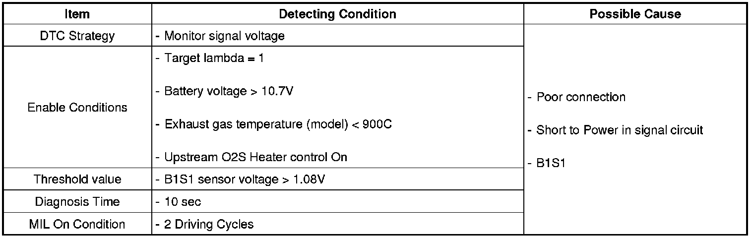 If the sensor output is over 1.08 V under enable conditions, ECM sets P0132.
