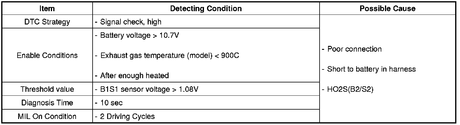 After warming-up, if accelerator pedal is released suddenly around 4000 rpm, the HO2S signal reading will be lower than 200mV resulting from Fuel cut-off for the moment. Conversely, if suddenly accelerator pedal is depressed, HO2S signal reading will be around 0.6 V ~1.0 V. At idle, Normally HO2S signal will switch from lean to rich with 3 Hz. And as racing, Its frequency rises.