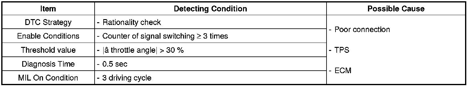 If the deviation between the throttle position by TPS 2 signal and the throttle position by ECM's model value is bigger than the threshold value under TPS 1 error, ECM sets DTC P0221.