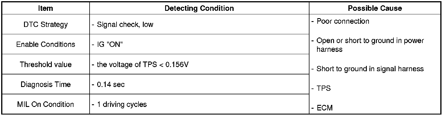 If the sensor input voltage is lower than the minimum threshold value during 0.14 sec under normal driving condition, ECM sets DTC P0222.
