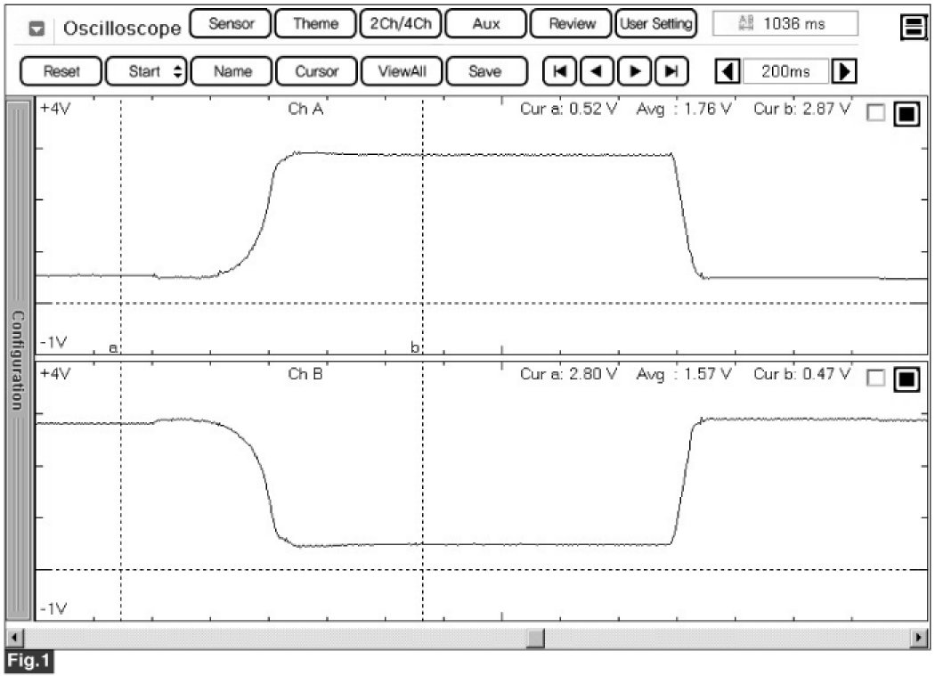 Fig 1) Normal waveform of TPS 1 & TPS 2 with no accel pedal depressed under IG ON condition