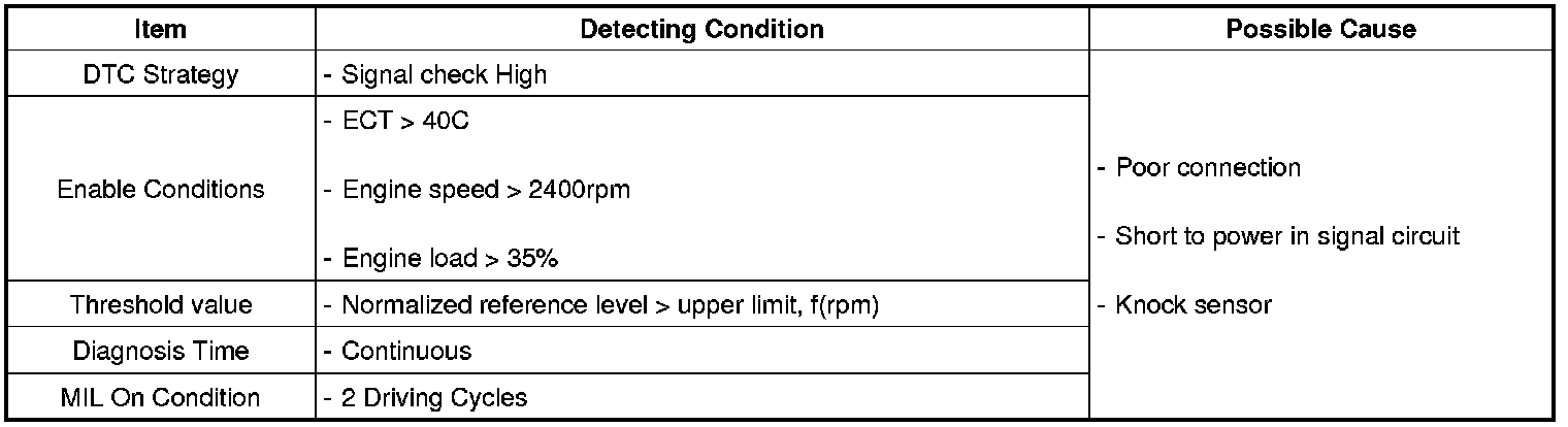 The knock sensor is attached to the cylinder block and senses engine knocking. The sensor contains a piezoelectric element that converts vibration (or noise) into voltage signal and sends this signal to ECM. With input signals from camshaft position and crankshaft position sensor, ECM can identify which cylinder is knocking. ECM filters vibrations and determines if the vibrations are knocking signal. The Engine Control Module (ECM) uses this signal to suppress knocking by retarding ignition timing. The ECM will set a code (Malfunction Indicator Lamp will Not turn on) if during two driving cycles the Knock sensor's output voltage falls below minimum threshold. This code indicates an unexpected vibration is being read by the Knock sensor or ECM under normal engine operation.