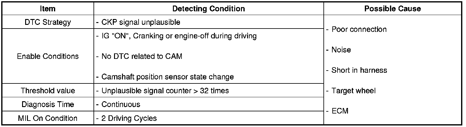 The Crankshaft Position Sensor (CKPS) is a magnetic field sensitive type sensor that generates voltage using a sensor and a target wheel mounted on the crankshaft; there are 58 slots in the target wheel where one is longer than the others. During one crankshaft rotation there are 58 rectangular signals and one longer signal. The ECM calculates engine RPM by using the sensor's signal and controls the injection duration and the ignition timing. Using the signal differences caused by the longer slot, the ECM identifies which cylinder is at top dead center.