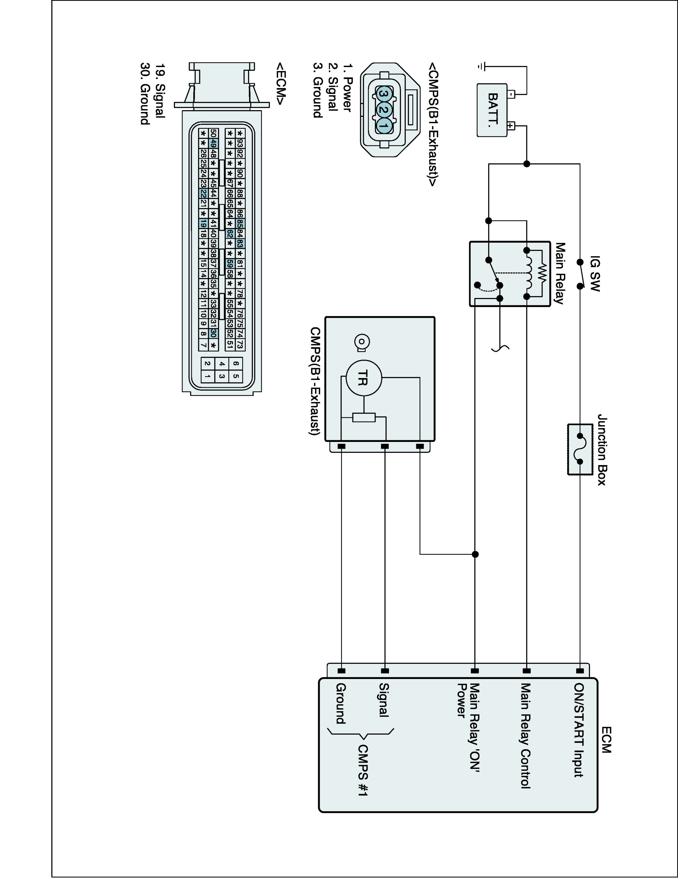 The Camshaft Position Sensor (CMPS) is a sensor that detects the compression TDC of the NO. 1 cylinder. The CMPS consists of a hall type sensor and a target on the end of the intake camshaft. When the target triggers the sensor, the sensor voltage is 5 V. If not, the sensor voltage is 0 V. These CMPS signal is sent to the ECM and the ECM uses the CMPS signal for synchronizing the firing of sequential fuel injectors.