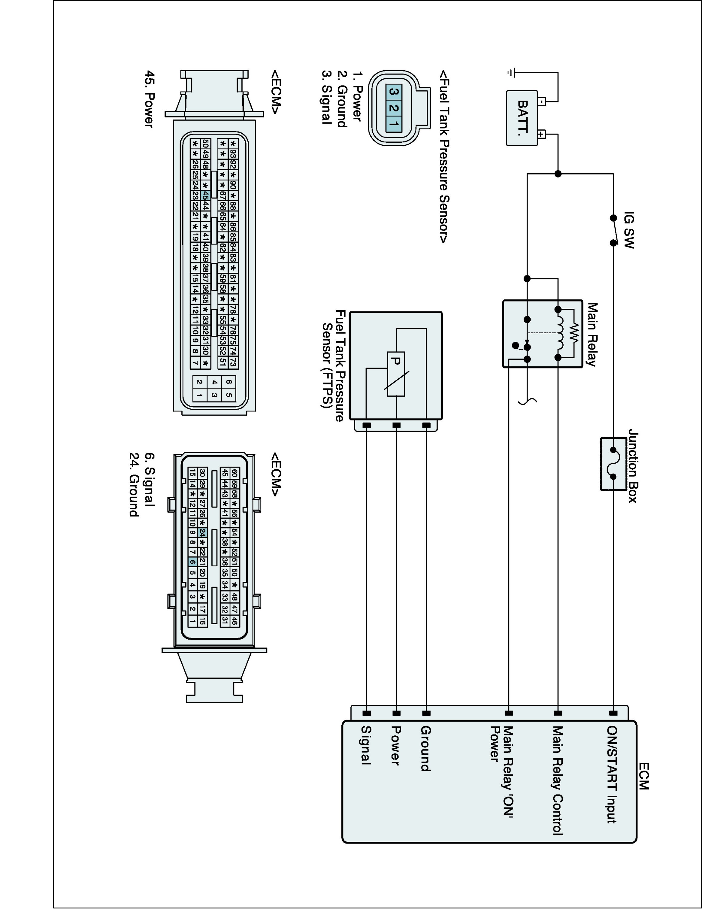 The evaporative emission control system prevents hydrocarbon vapors from escaping from the fuel tank into the atmosphere where they could form photochemical smog. Gasoline vapors are collected in the charcoal canister. The Fuel Tank Pressure Sensor (FTPS) is an integral part of the evaporative monitoring system. The ECM monitors the FTPS signal to detect vacuum decay and excess vacuum. The FTPS measures the difference between the air pressure inside the fuel tank and outside air pressure to check the purge control solenoid valve operation and for leak detection in the evaporative emission control system by monitoring pressure and vacuum levels in the fuel tank during the purge control solenoid valve operating cycles.
