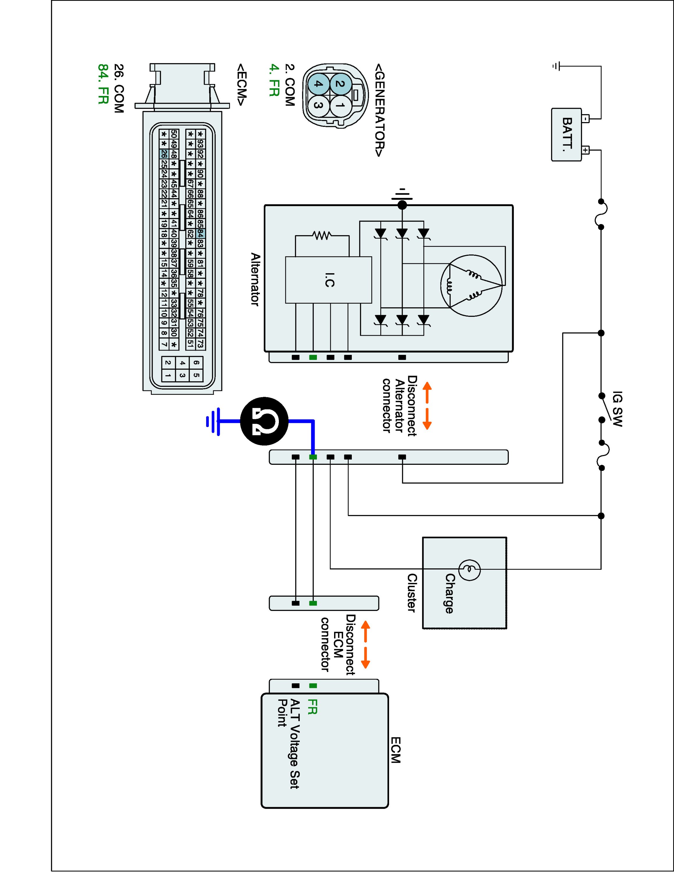 1. With ignition OFF, disconnect alternator connector, and ECM connector.