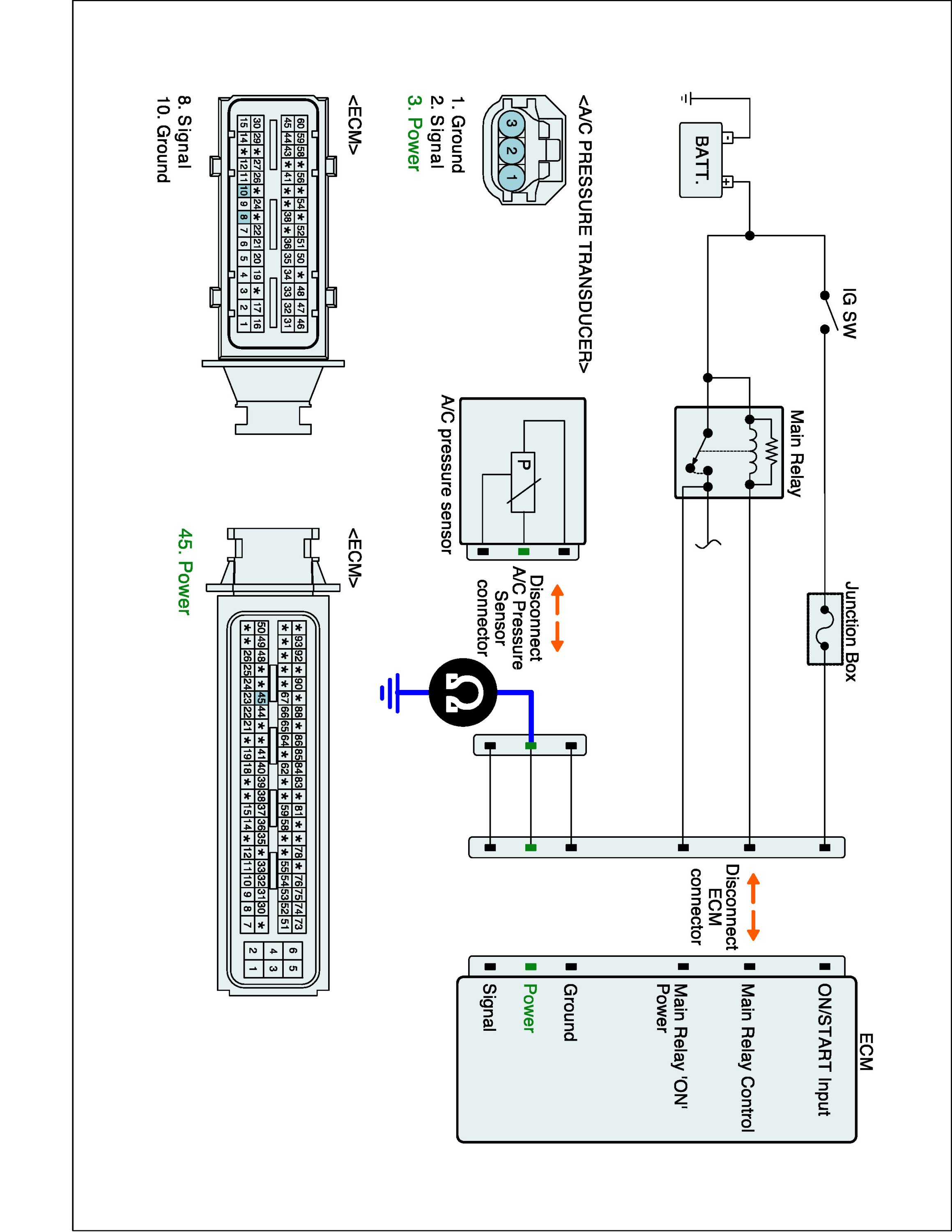 1. IG "OFF" and disconnect A/C Refrigerant Pressure Sensor,Fuel Tank Pressure Sensor connector.