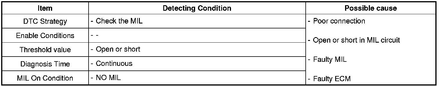 If there is Open, Short to ground or Short to power in MIL circuit, PCM sets DTC P0650.