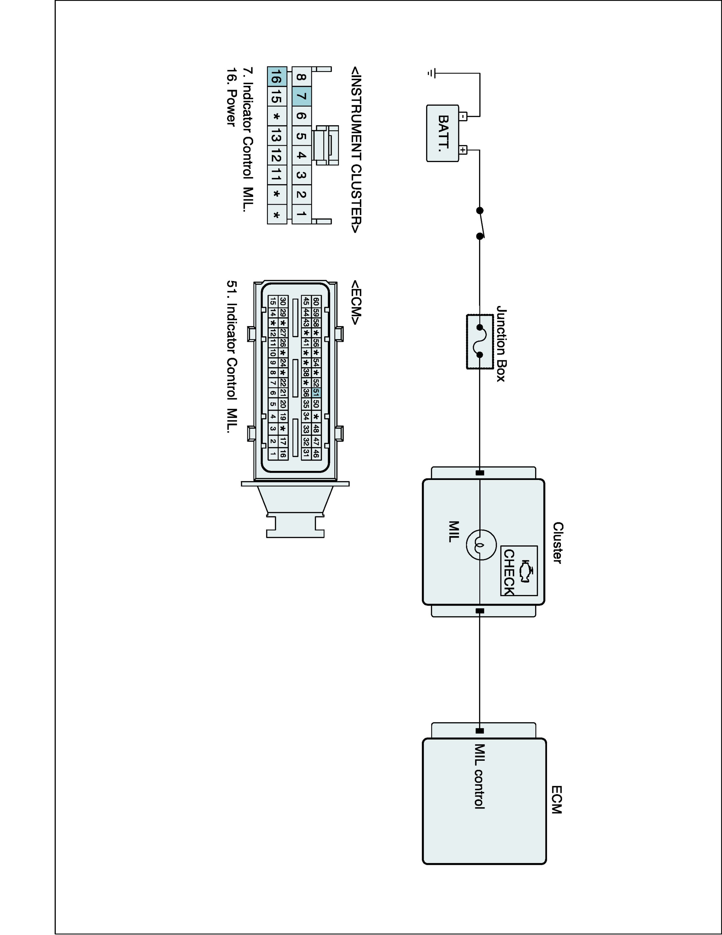 The Malfunction Indicator Lamp (MIL), which is located in the instrument cluster, comes on to notify the driver that there may be a problem with the vehicle and that service is needed. Immediately after the ignition switch turns on, the malfunction indicator lamp is lit to indicate that the MIL operates normally and goes off after starting