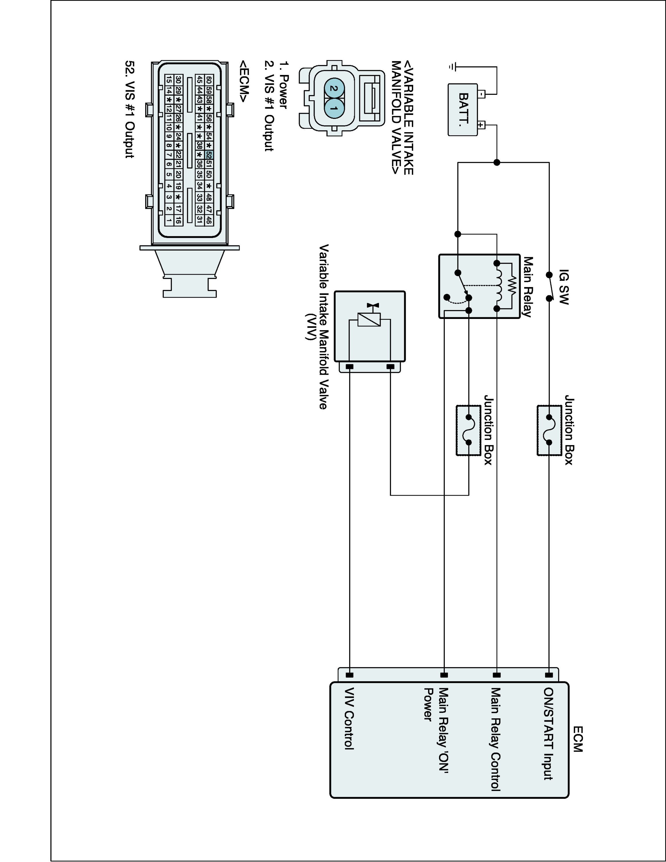 VIS (Variable intake system) is a device which varies the length of intake manifold to genetate maximum power at certain RPM. VIS lengthens intake manifold to improve the torque at low RPM when vehicle speed is low while it shortens intake manifold to raise torque at high RPM when vehicle speed is high. PCU controls VIS using RPM signal.