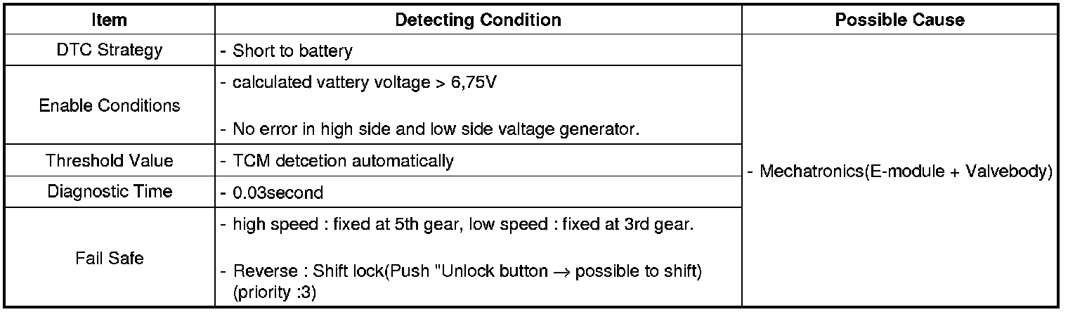 TCM set this code If detected higher voltage that drive voltage of solenoid valve than available range. (MIL ON : 2 driving Cycle)