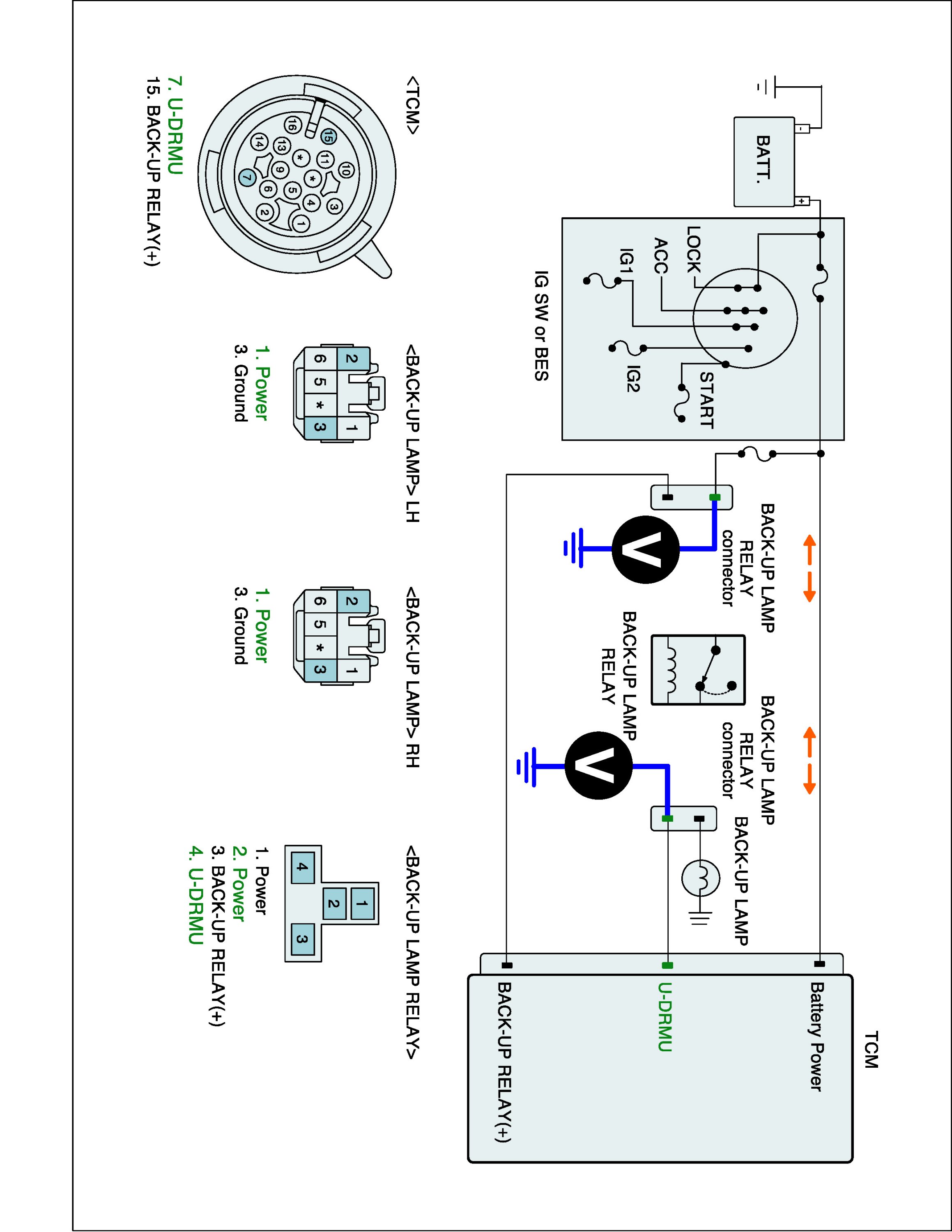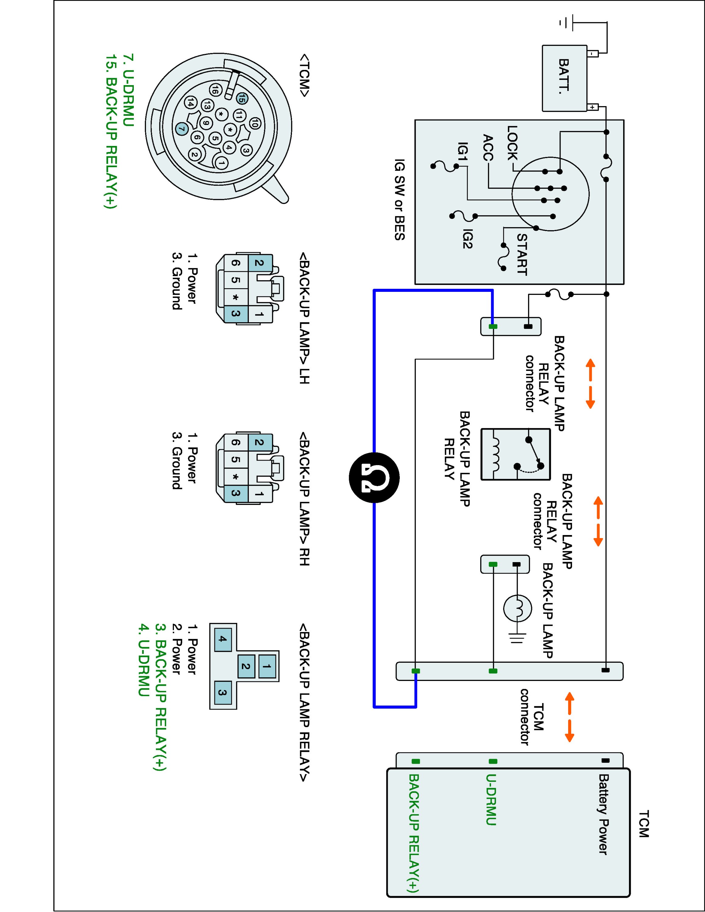 3. Check the resistance of BACK-UP LAMP control circuit between TCM harness connector and BACK-UP LAMP harness side.