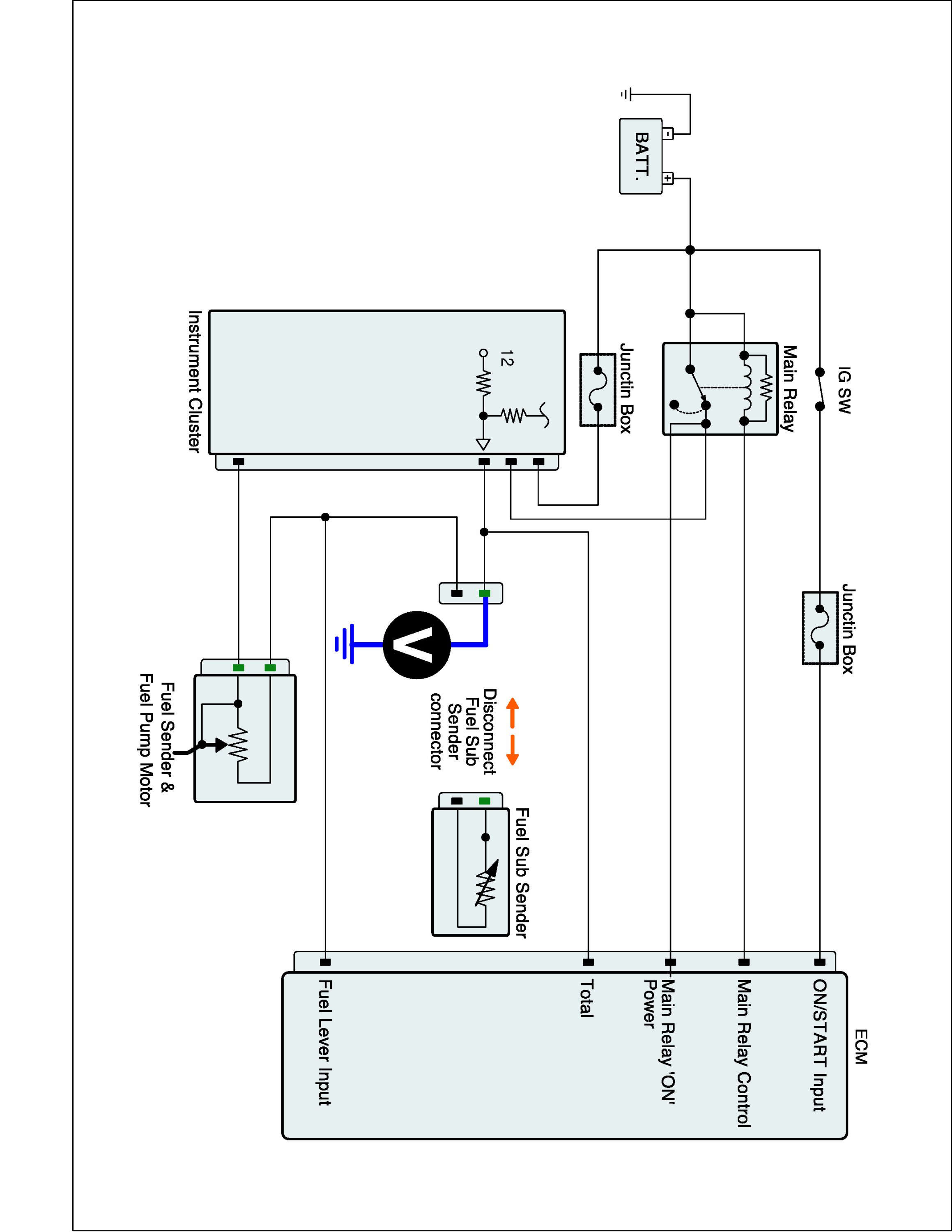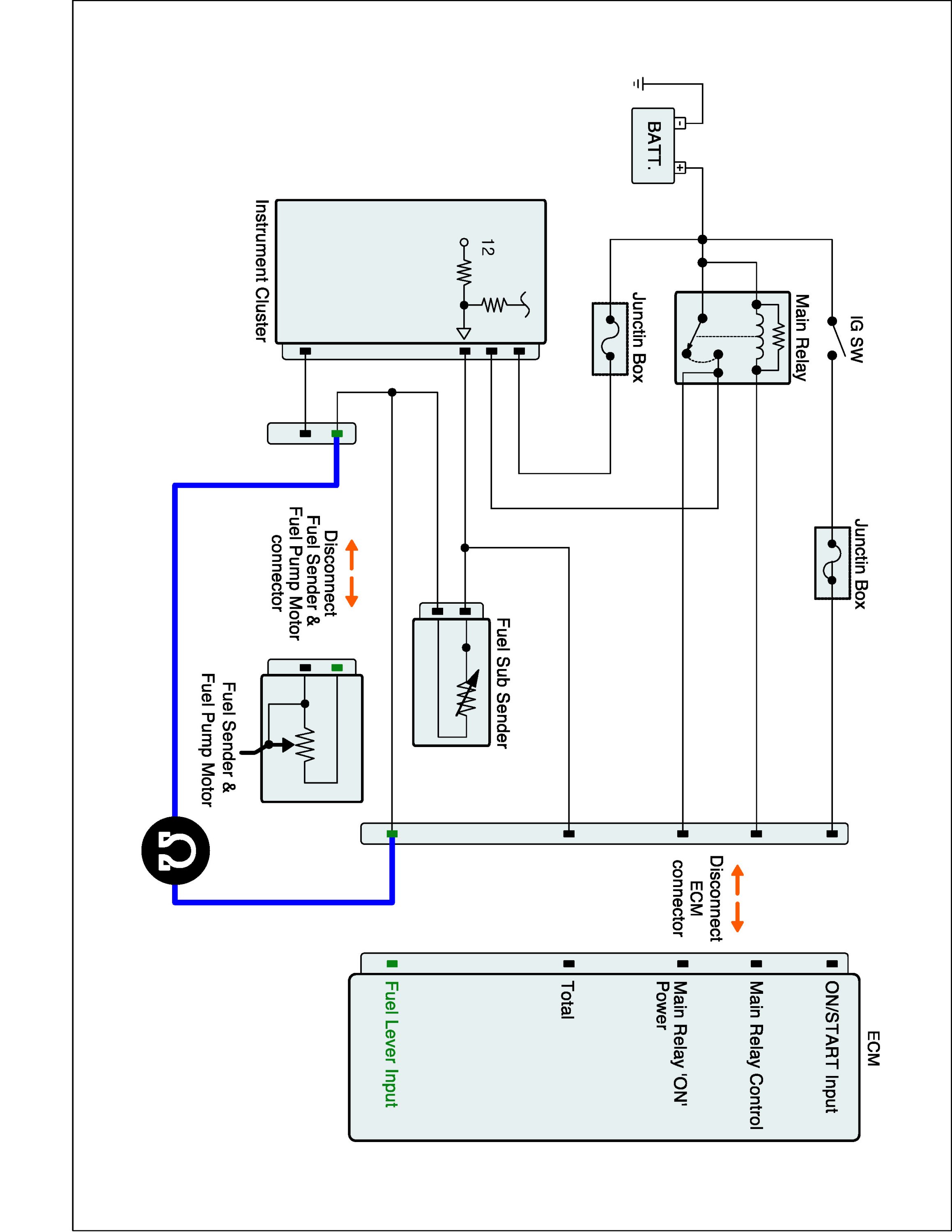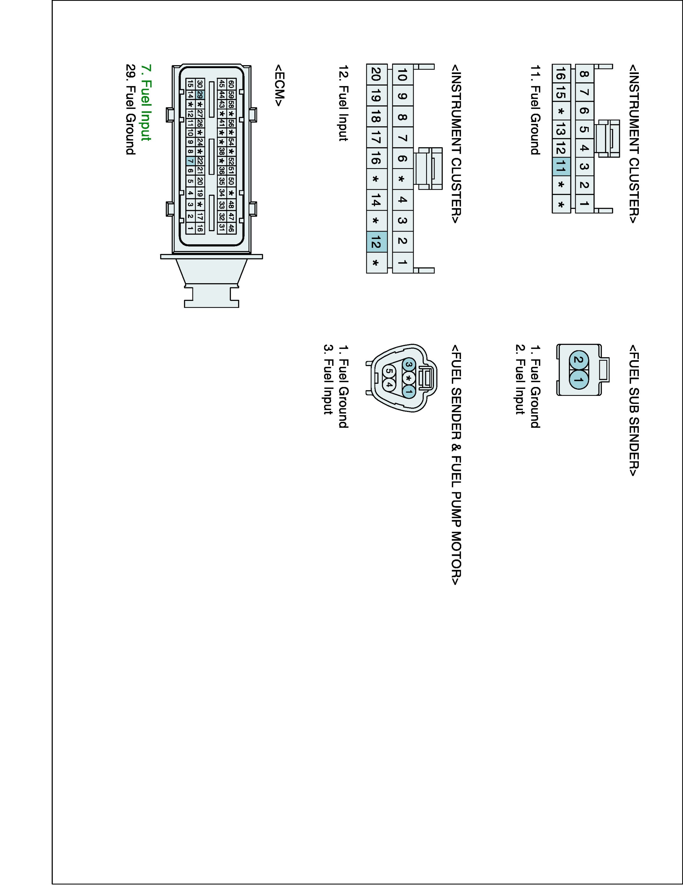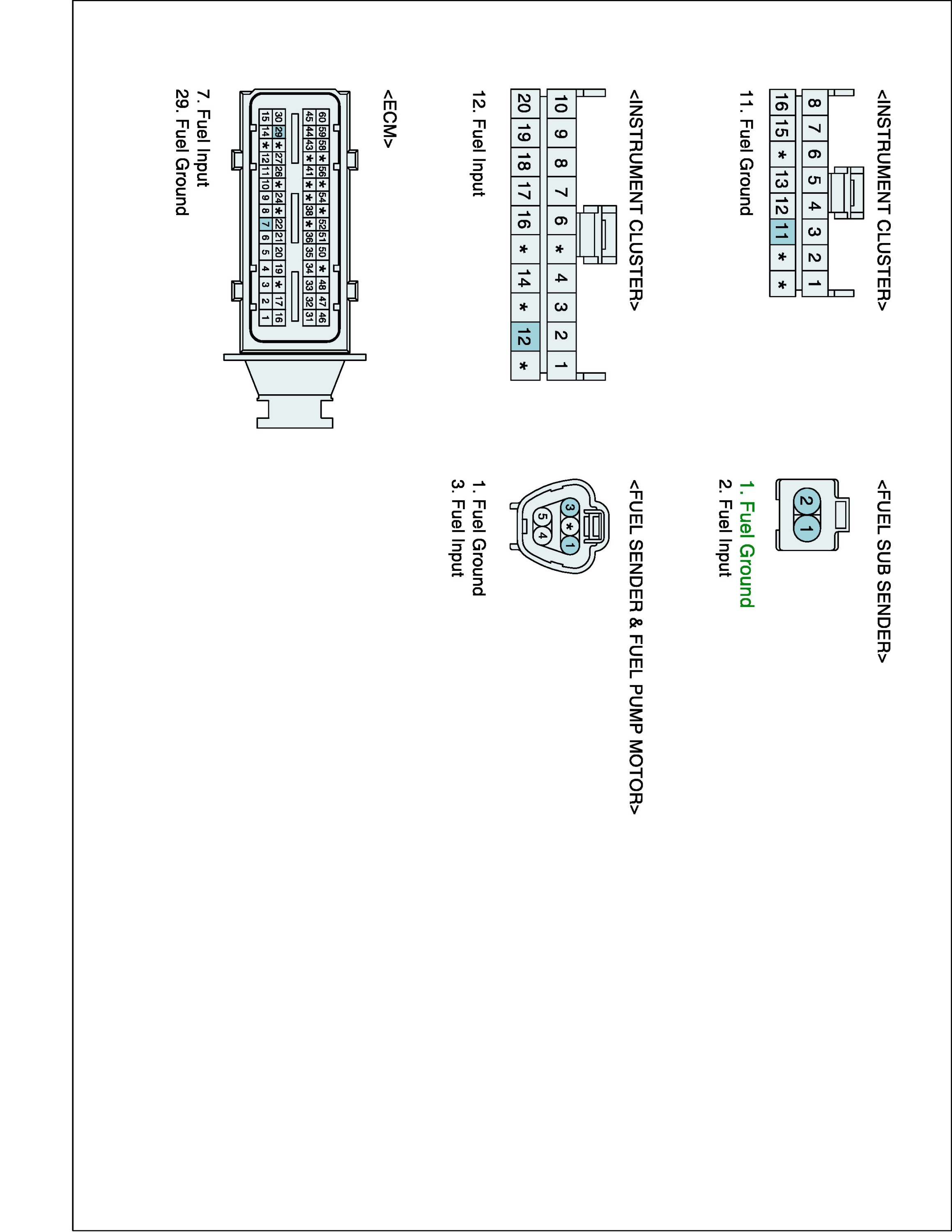 1. IG "OFF" and disconnect Fuel Sender A & Fuel Pump Motor connector, Fuel Sub Sender B connector and ECM connector.