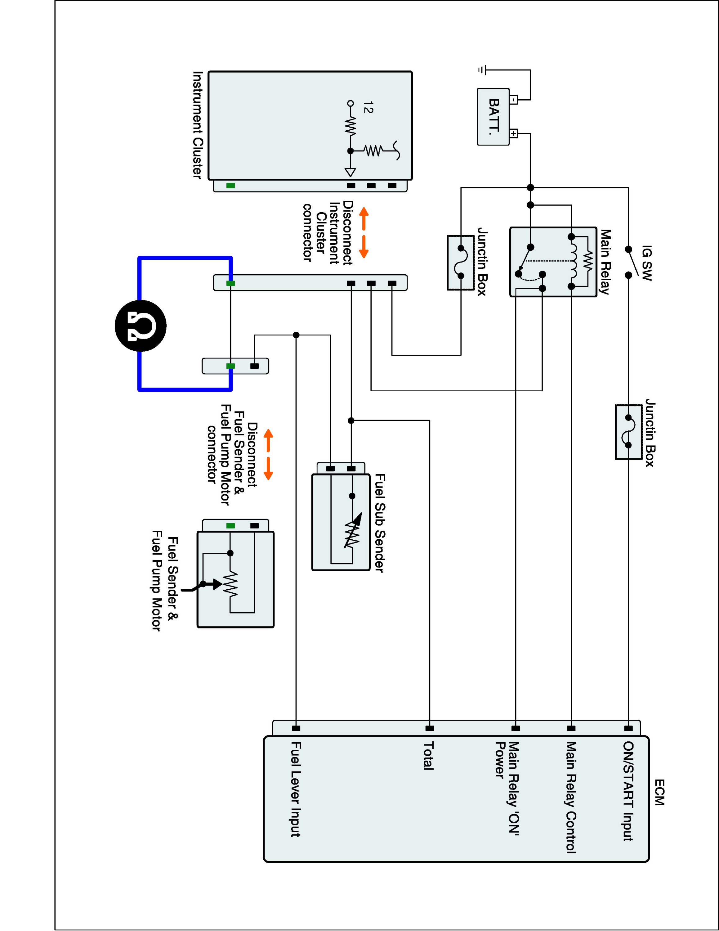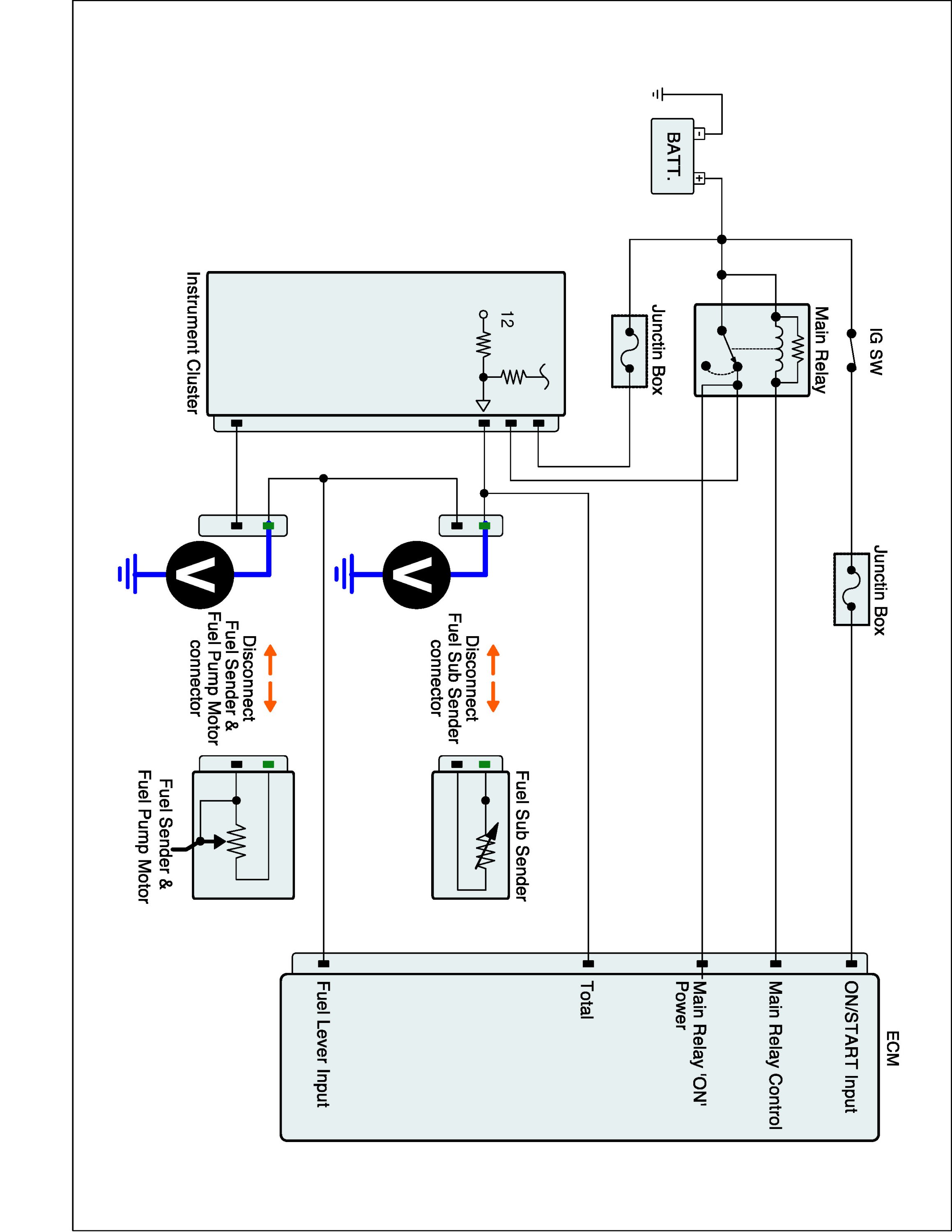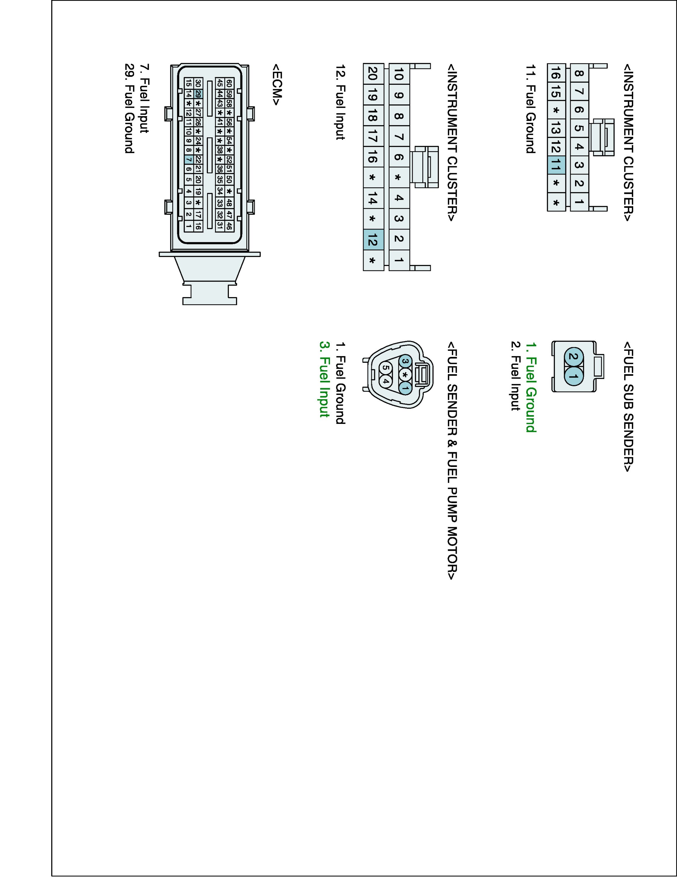 1. IG "OFF" and disconnect Instrument cluster connector, Fuel Sender A & Fuel Pump Motor connector, and Fuel Sub Sender connector.