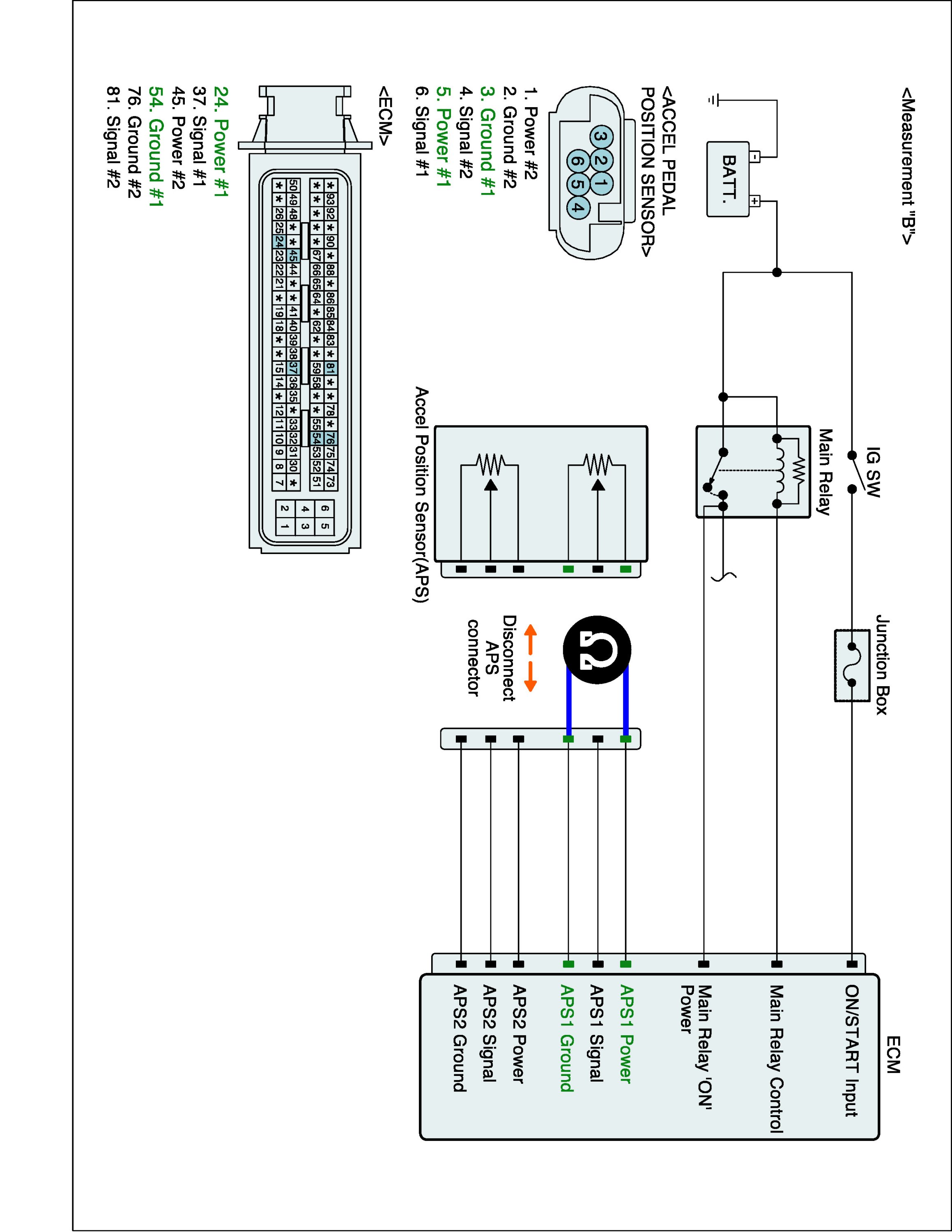 3. Measure voltage between APS 1 power and APS 1 ground terminals of APS harness connector. (Measurement "B")