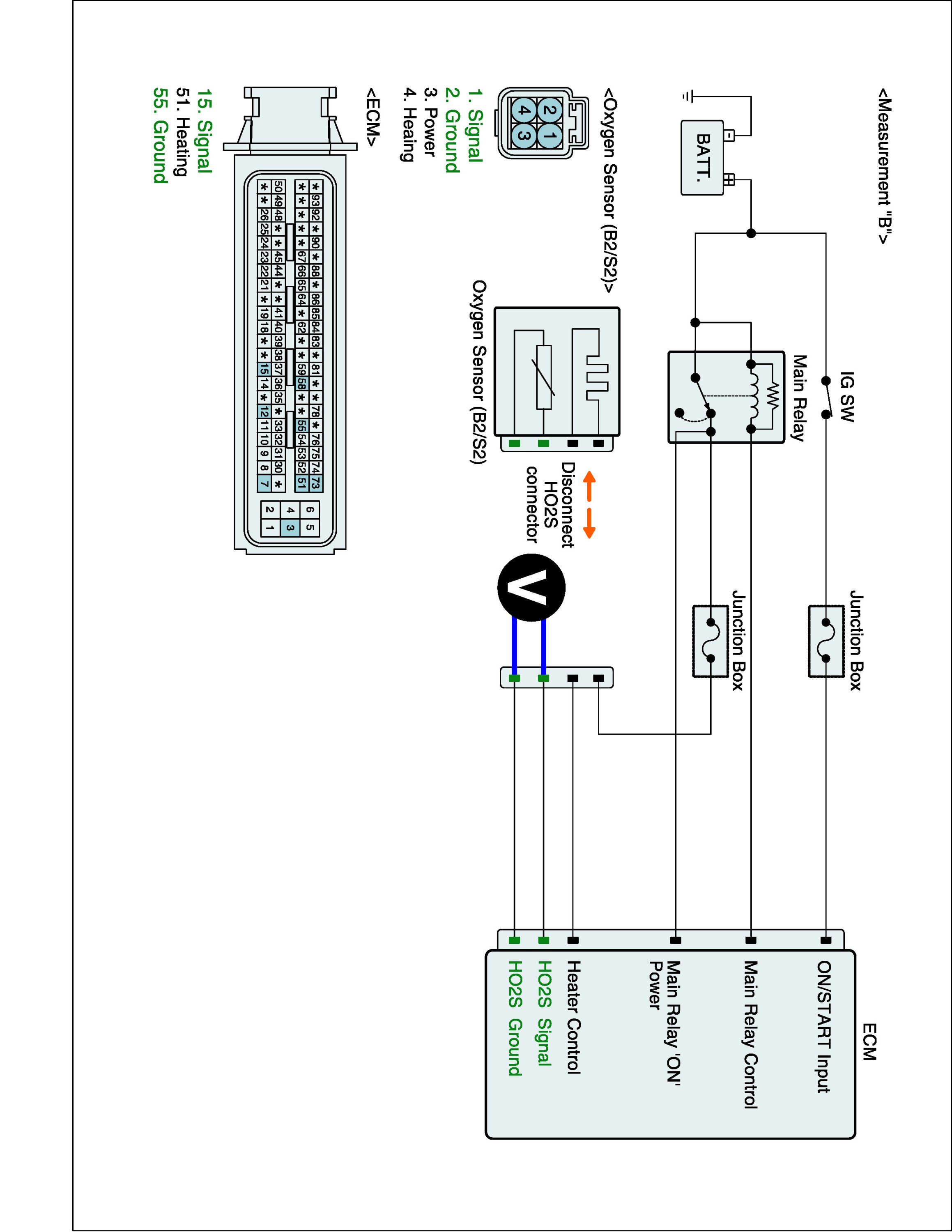 3. Measure voltage between signal and ground terminals of HO2S (B2/S2) harness connector. (Measurement "B")