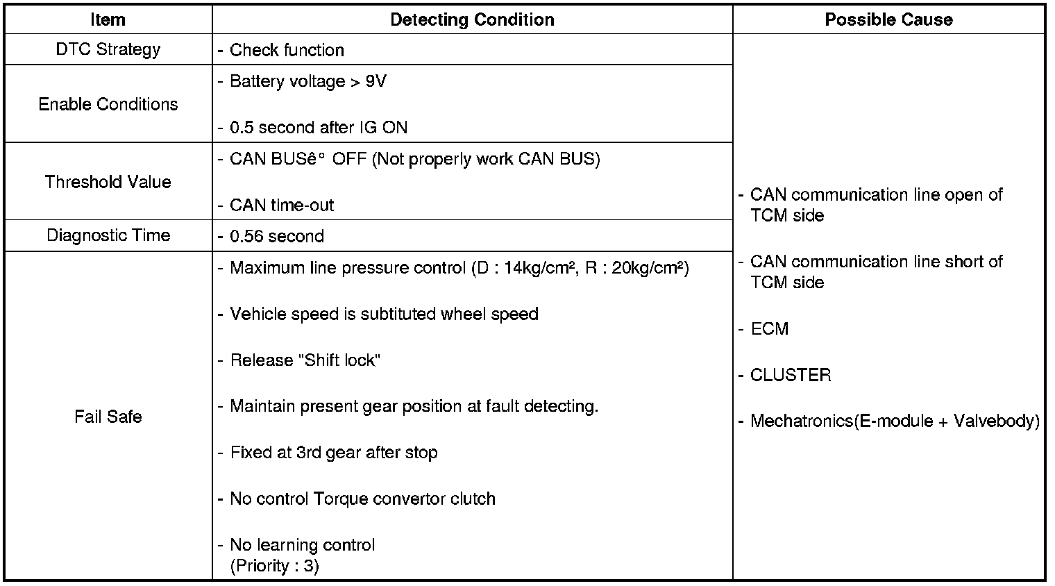 TCM set this code If detected error in CAN communication line. (MIL OFF)