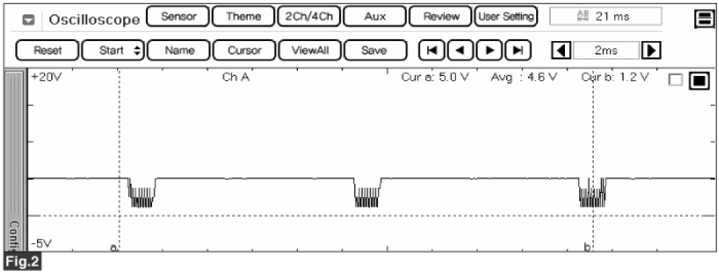 FIG.2) Normal MM Low CAN signal waveform while one input signal is given at armrest control switch of rear seat (measured waveform signal at MM Low CAN line of head unit)
