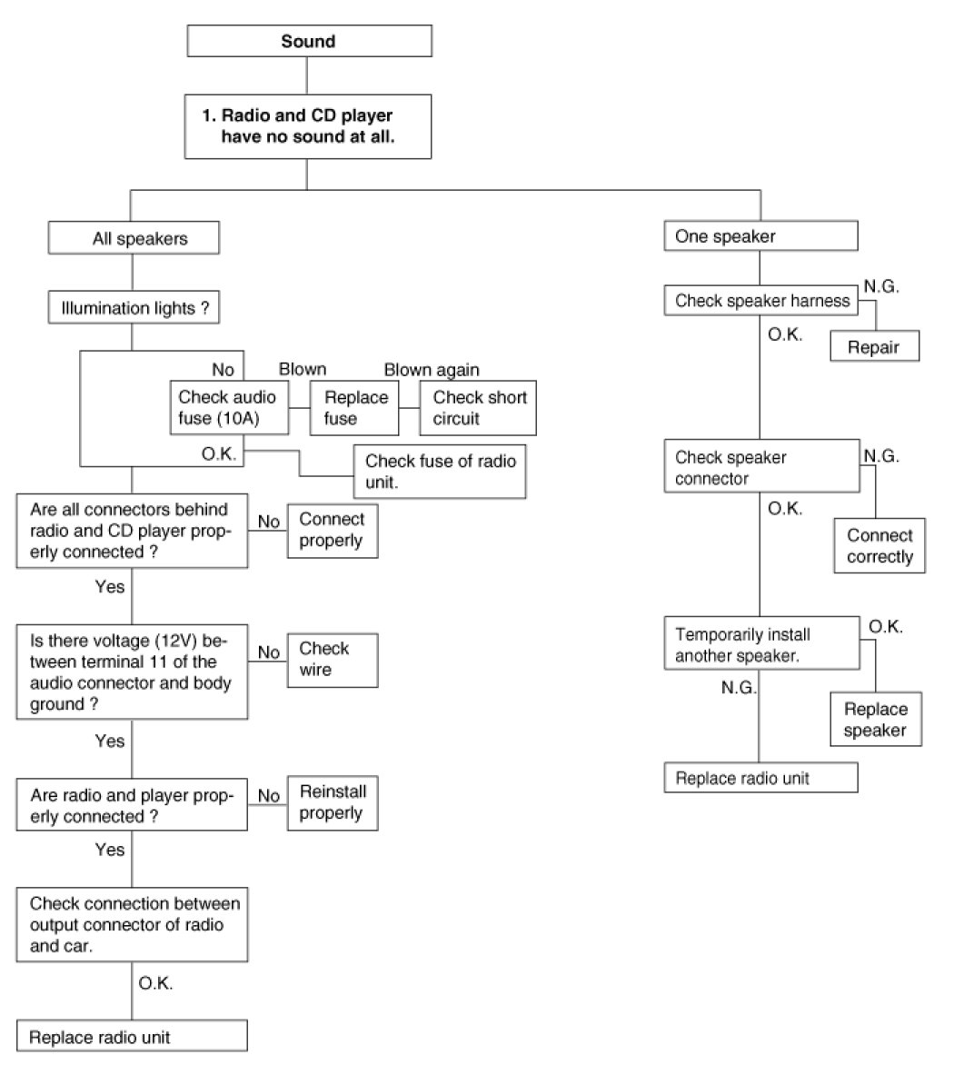 There are six areas where a problem can occur: wiring harness, the radio, the CD player, and speaker. Troubleshooting enables you to confine the problem to a particular area.