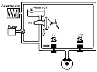 For optimum brake from the certain wheel acceleration a brake pressure increase is necessary. For this, the inlet valve IV is opened and the outlet valve OV is closed. The pump of the unit starts to run and aspirates the necessary quantity of fluid from the Low-pressure accumulator, in order to produce the necessary brake pressure for the pressure increase phase in seconds.
