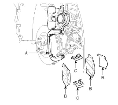 3. Replace pad shim (B), pad retainers (C) and brake pads (B) in the caliper bracket (A).