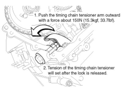 B. To set tension of the timing chain tensioner, push the timing chain tensioner arm outward with a force about 150N (15.3kgf, 33.7lbf).