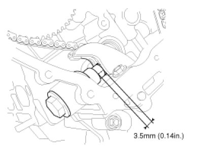 C. To check the tension of the timing chain tensioner, push the timing chain tensioner arm outward strongly. The distance between the tensioner body and end of tensioner plunger should be about 3.5mm (0.14inch).
