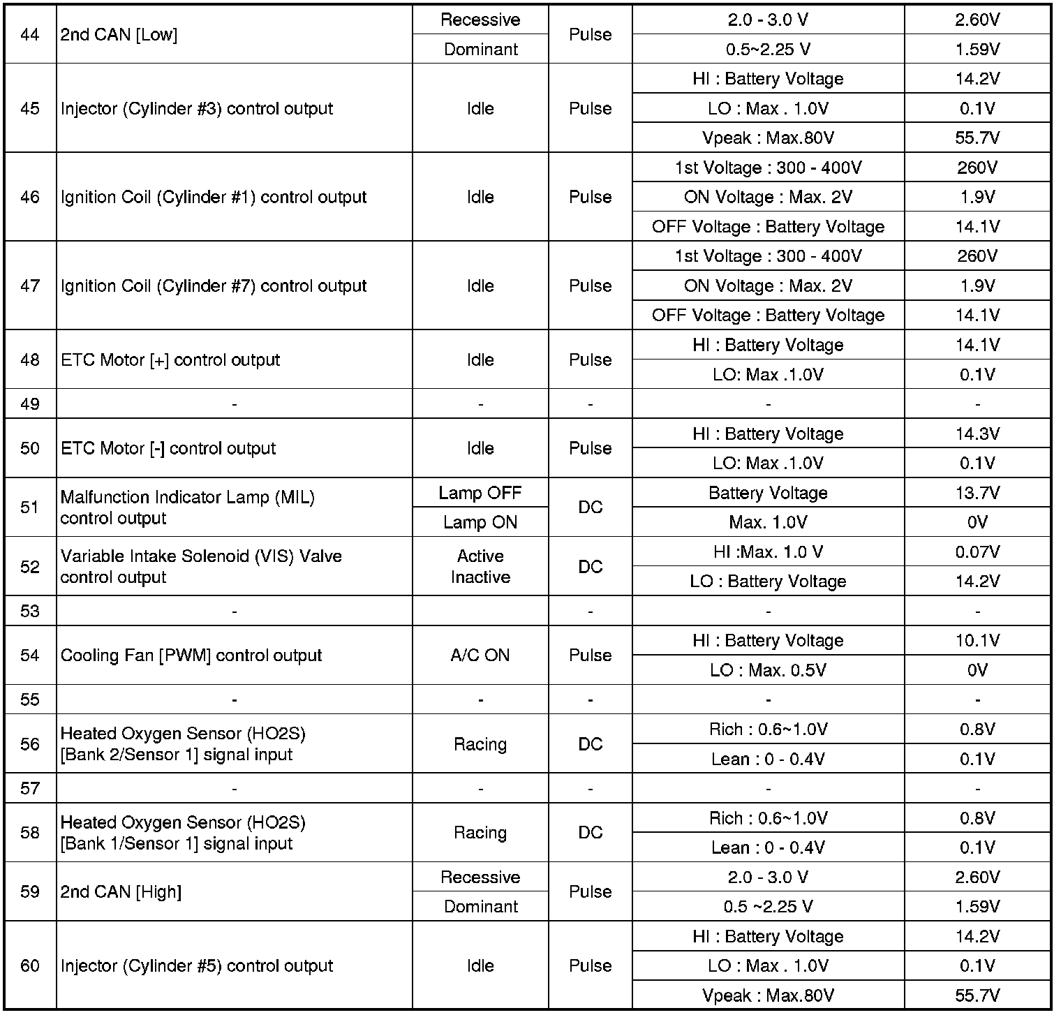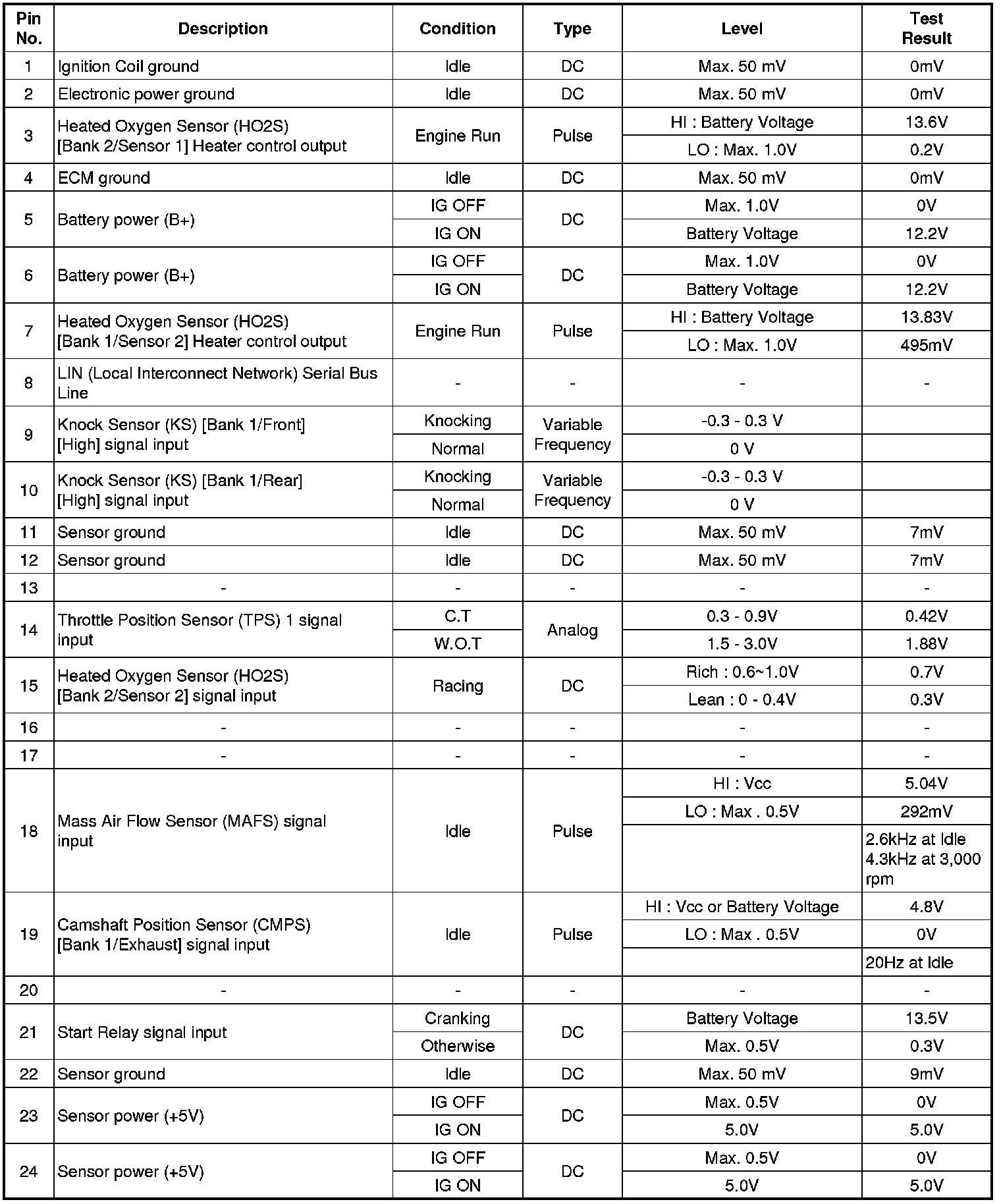 Pinout Values and Diagnostic Parameters