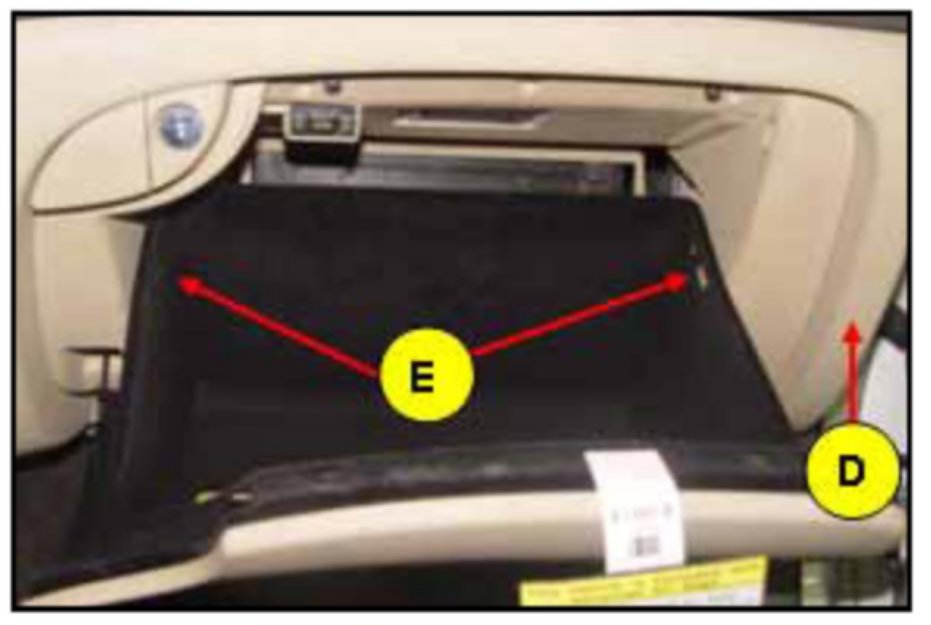 6-2 Remove the glove box assembly mounting upper and lower screws and allow the glove box assembly to hang. Do not remove wiring connectors (F) and air damper (G).