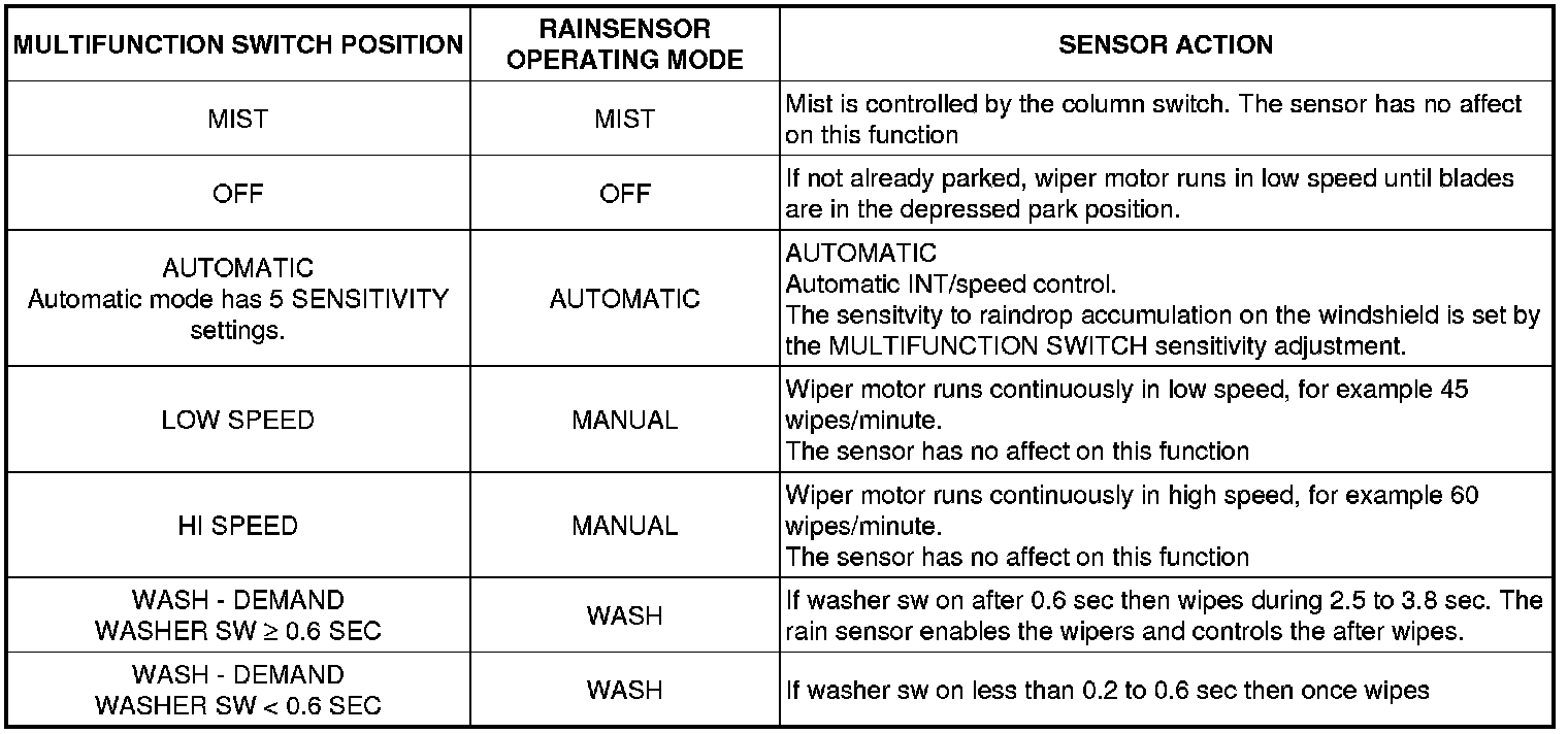 The Rainsensor monitors the MULTIFUNCTION SWITCH to determine if the wash function is selected. Rainsensor enables the wiper motor to run in low speed during the wash mode and performs follow up wipes during 2.5 to 3.8 sec.