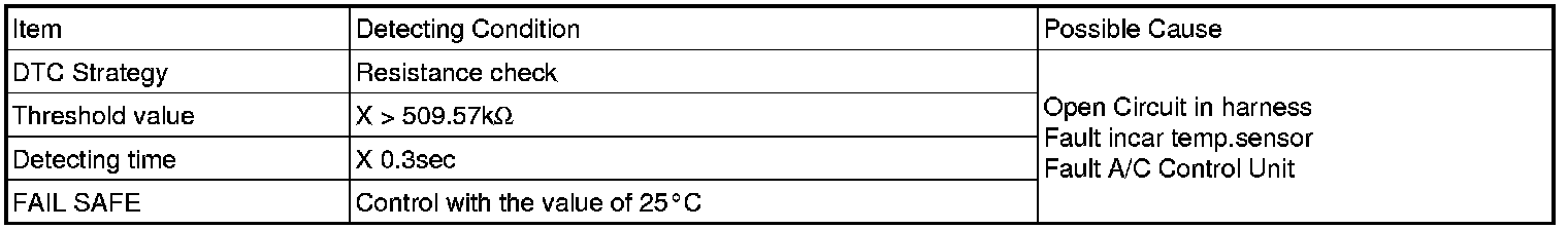 The ECM sets DTC B1234 if there is an open circuit in incar temp sensor signal harness or the measured resistance value of the sensor is more than the threshold value (about 509.57 kOhms)