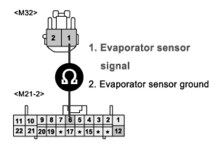 3. Measure resistance between terminal "2" of evaporator sensor and chassis ground.