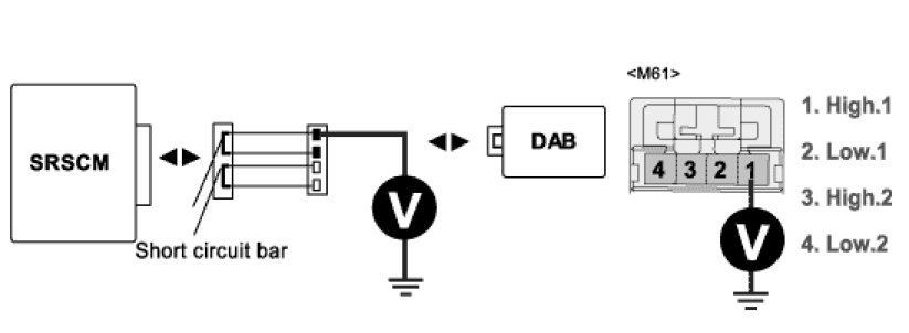 4. Measure voltage between terminal "1 or 2" of the DAB harness connector and chassis ground.