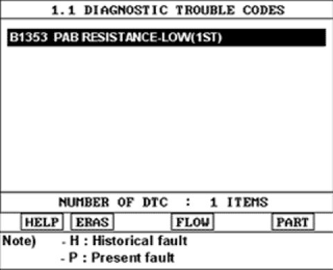 1) Displaying nothing (no DTC) or DTC with label "H" (historical) shows that Fault is intermittent caused by poor contact in the part's and/or SRSCM connector or was repaired and SRSCM memory was not cleared.