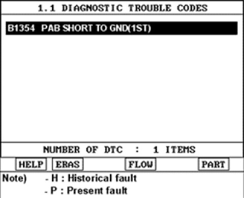 1) Displaying nothing (no DTC) or DTC with label "H" (historical) shows that Fault is intermittent caused by poor contact in the part's and/or SRSCM connector or was repaired and SRSCM memory was not cleared.