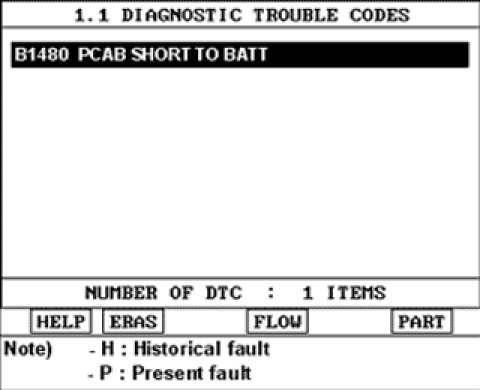 1) Displaying nothing (no DTC) or DTC with label "H" (historical) shows that Fault is intermittent caused by poor contact in the part's and/or SRSCM connector or was repaired and SRSCM memory was not cleared.