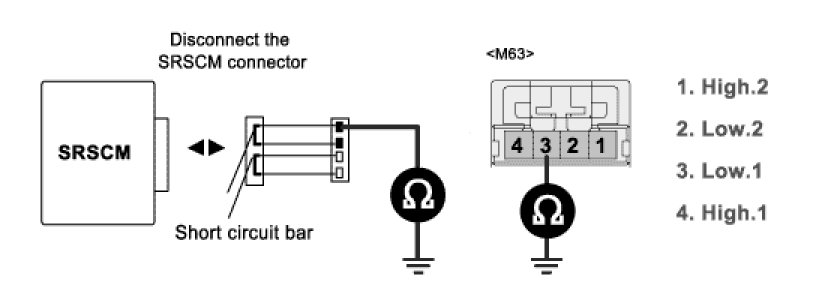 4. Measure resistance between terminal "3" or "4" of the PAB harness connector and chassis ground.