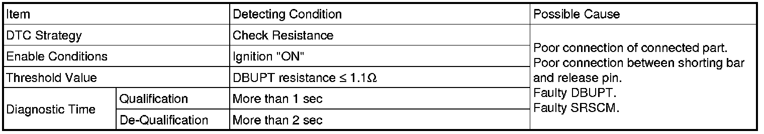 The SRSCM sets DTC B1702 if the measured resistance value of DBUPT circuit is less than the threshold value.