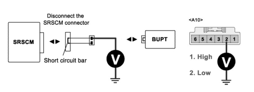 5. Measure voltage between terminal "1 or 2" of the BUPT harness connector and chassis ground.