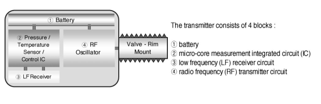 This transmitter is a transmitter device with tire valve, which is mounted in the valve hole of the wheel rim and transmits the pressure and temperature inside the tire, the battery voltage of the transmitter, and the tire identification code (ID) at normal and abnormal condition with the radio wave (RF) that conforms to the used area. Also this device has a countermeasure function such as the random delay of transmission time so that the RF signal from each tire will not interfere due to simultaneous transmission. Wheel sensors shall support usage on steel or aluminum rims.