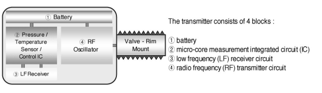 This transmitter is a transmitter device with tire valve, which is mounted in the valve hole of the wheel rim and transmits the pressure and temperature inside the tire, the battery voltage of the transmitter, and the tire identification code (ID) at normal and abnormal condition with the radio wave (RF) that conforms to the used area. Also this device has a countermeasure function such as the random delay of transmission time so that the RF signal from each tire will not interfere due to simultaneous transmission. Wheel sensors shall support usage on steel or aluminum rims.