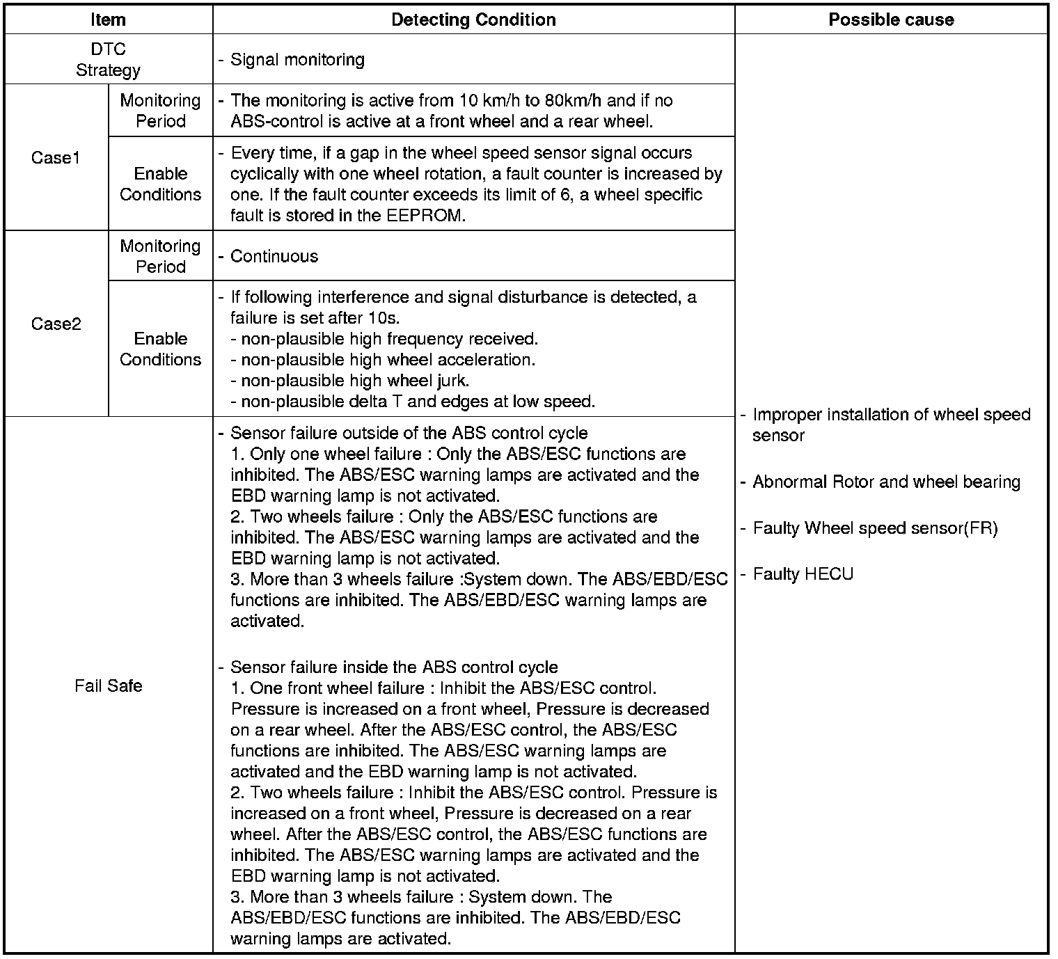The ABS ECU monitors the wheel speed sensor signal continuously. This code is set when an abnormal signal due to air gap problem or an abnormal speed change ratio are detected at the vehicle speed between 10 km/h to 60 km/h. Warning lamp is turned OFF unless fault is detected any more when the IG KEY is turned ON again, and wheel speed is more than 12 Km/h.