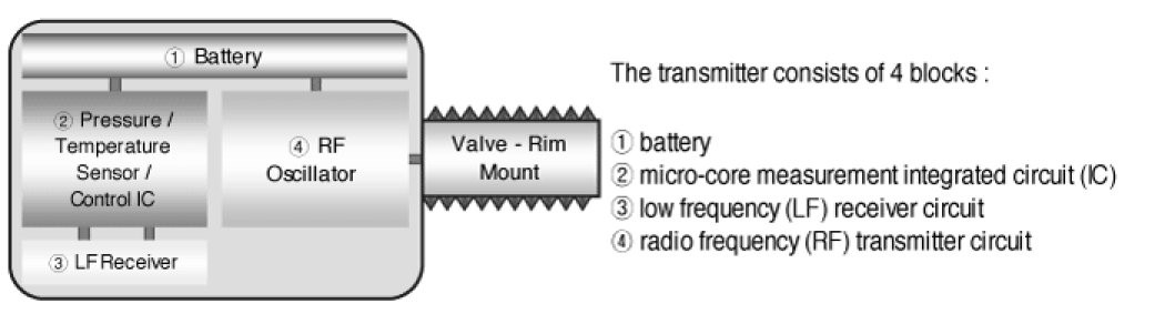 This transmitter is a transmitter device with tire valve, which is mounted in the valve hole of the wheel rim and transmits the pressure and temperature inside the tire, the battery voltage of the transmitter, and the tire identification code (ID) at normal and abnormal condition with the radio wave (RF) that conforms to the used area. Also this device has a countermeasure function such as the random delay of transmission time so that the RF signal from each tire will not interfere due to simultaneous transmission. Wheel sensors shall support usage on steel or aluminum rims.