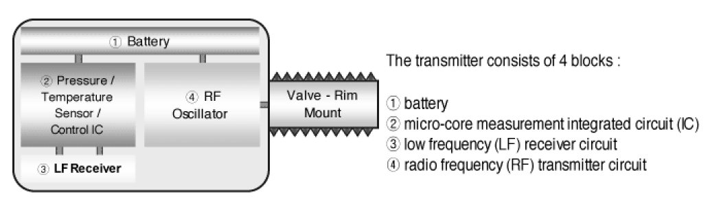 This transmitter is a transmitter device with tire valve, which is mounted in the valve hole of the wheel rim and transmits the pressure and temperature inside the tire, the battery voltage of the transmitter, and the tire identification code (ID) at normal and abnormal condition with the radio wave (RF) that conforms to the used area. Also this device has a countermeasure function such as the random delay of transmission time so that the RF signal from each tire will not interfere due to simultaneous transmission. Wheel sensors shall support usage on steel or aluminum rims.