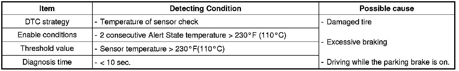 This DTC indicates that the sensor has seen a temperature in excess of 230°F (110°C). At 257°F (125°C), the sensor will shut down and the warning is therefore so that the driver knows that there is a problem with the vehicle that may affect tire performance.