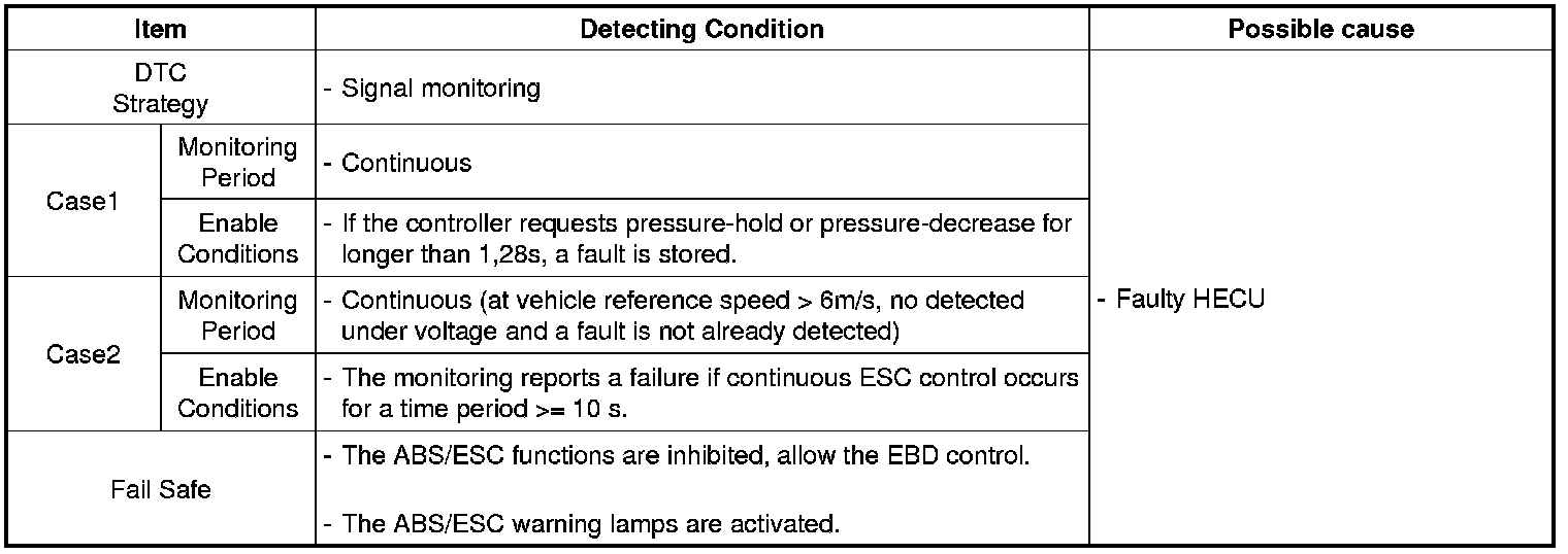 Under normal conditions, the inlet valves of all four wheels are not closed during control for longer than 1,28s or If the controller requests pressure-hold or pressure-decrease for longer than 1,28s, a fault is detected. The ABS/ESC warning ramp is turned ON and the EBD warning ramp is turned OFF.