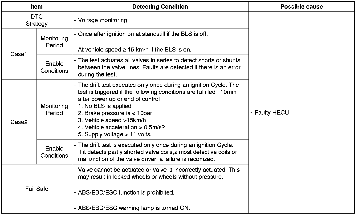 The HECU monitors the operation of the valves by checking the drive circuit of the solenoid valves, and then sets this code when the unexpected drive voltage is detected. For example, the HECU sets the DTC if the electrical feedback signal does not match the actuation signal for the corresponding valve.