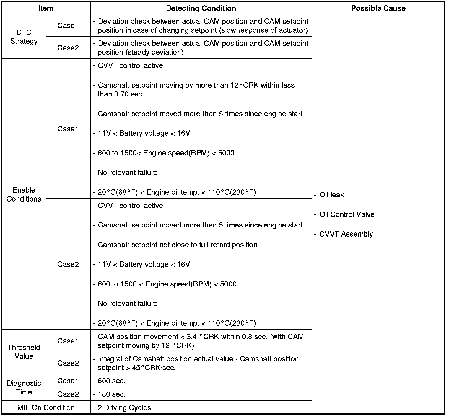 The deviation of the camshaft position from the target point is evaluated during stable driving condition. The PCM accumulates this deviation for a certain period and sets DTC P0011 when the accumulated deviation is too high. The target camshaft position is predetermined value depending on engine speed and throttle angle in the PCM.