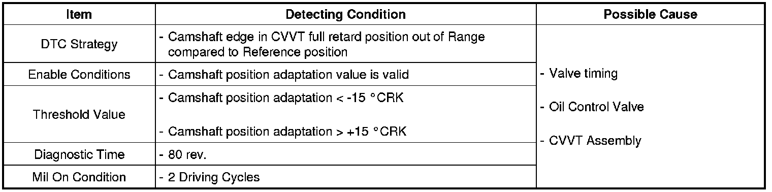 This diagnosis checks the camshaft position plausibility whether the expected range plus some margin is not violated that might be caused by a wrong engine repair, or a chain/belt misalignment. DTC P0017 is set when actual camshaft position is too much retarded or advanced than full retard position or full advance position. To continue the adjustment in such case could lead to a damage of the engine by hitting the valves with the piston.