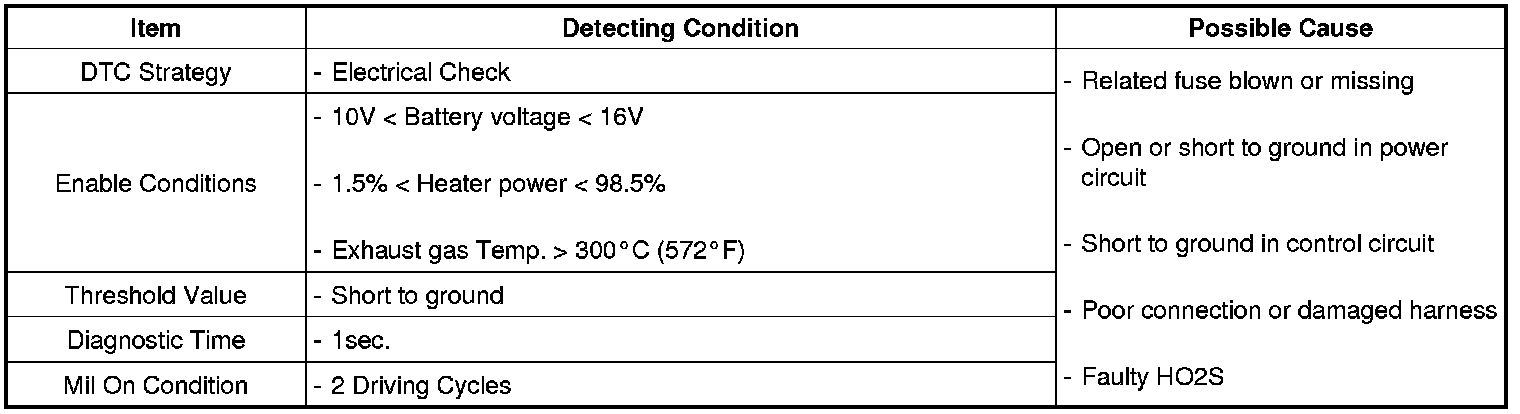 PCM sets DTC P0031 if the PCM detects that the front HO2S heater control circuit is short to ground.
